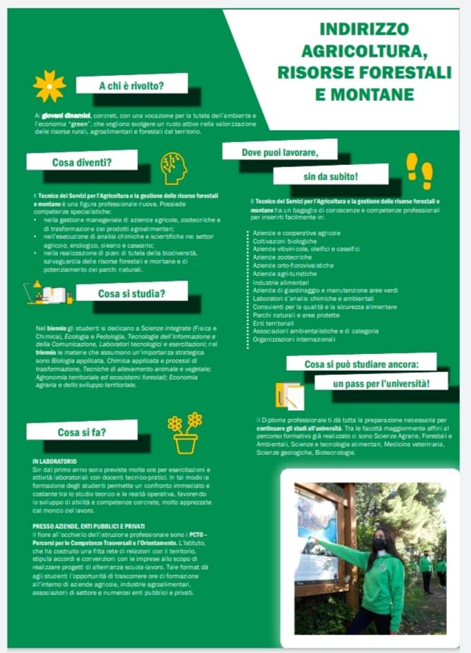 Siamo convinti che proporre ai giovani un corso di studi che si occupi della conoscenza della salvaguardia, della gestione e l’uso sostenibile delle risorse agrarie e forestali del territorio, dia la possibilità di perseguire il raggiungimento di un equilibrio tra la necessità di rispondere ai fabbisogni alimentari delle persone e la necessità di non incidere negativamente sullo stato di salute dell’ambiente.